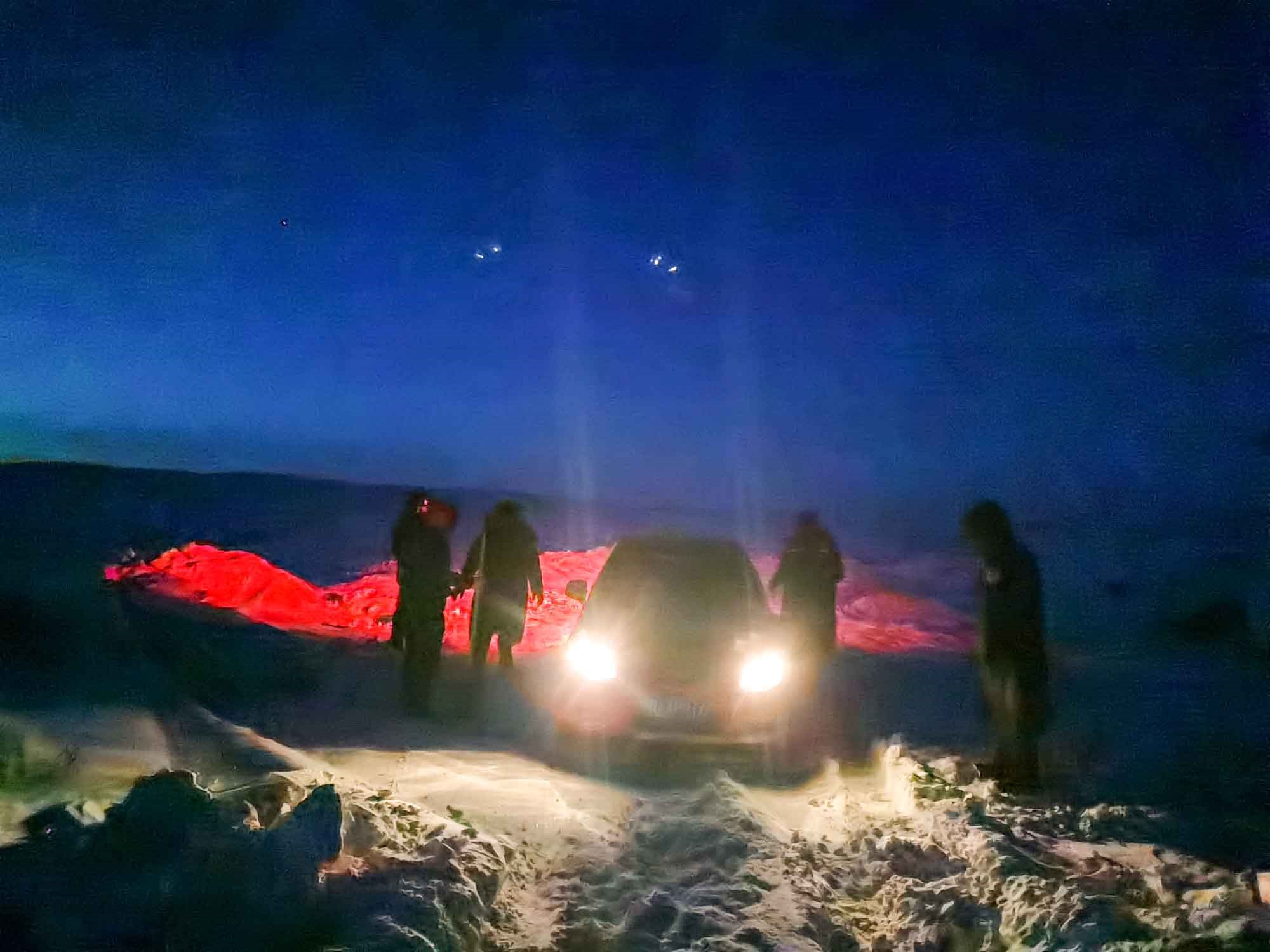1月17日17時(shí),那木吉拉與弟弟一同駕車返回百靈廟鎮(zhèn),在途經(jīng)一處被風(fēng)谷地時(shí),由于晚上視線較差,且此處坡度較大,不慎陷入雪中無(wú)法動(dòng)彈,只得撥通電話請(qǐng)求派出所救助。草原上沒(méi)有遮蔽物,常常到了下午就刮起大風(fēng),吹得積雪覆蓋在土地上分不清地勢(shì)高低,民警們按著平日下鄉(xiāng)走訪的經(jīng)驗(yàn)摸索前進(jìn),經(jīng)過(guò)近一小時(shí)才到達(dá)現(xiàn)場(chǎng),了解情況后,民警們將準(zhǔn)備好的熱水和棉大衣遞給牧民便展開(kāi)了救援工作。在零下35度的冬夜里,民警們用鐵鍬和雙手經(jīng)過(guò)近兩個(gè)小時(shí)的奮戰(zhàn)終于將40厘米厚的積雪清理干凈,并將被困車輛通過(guò)前拉后推的方式移至平坦區(qū)域。