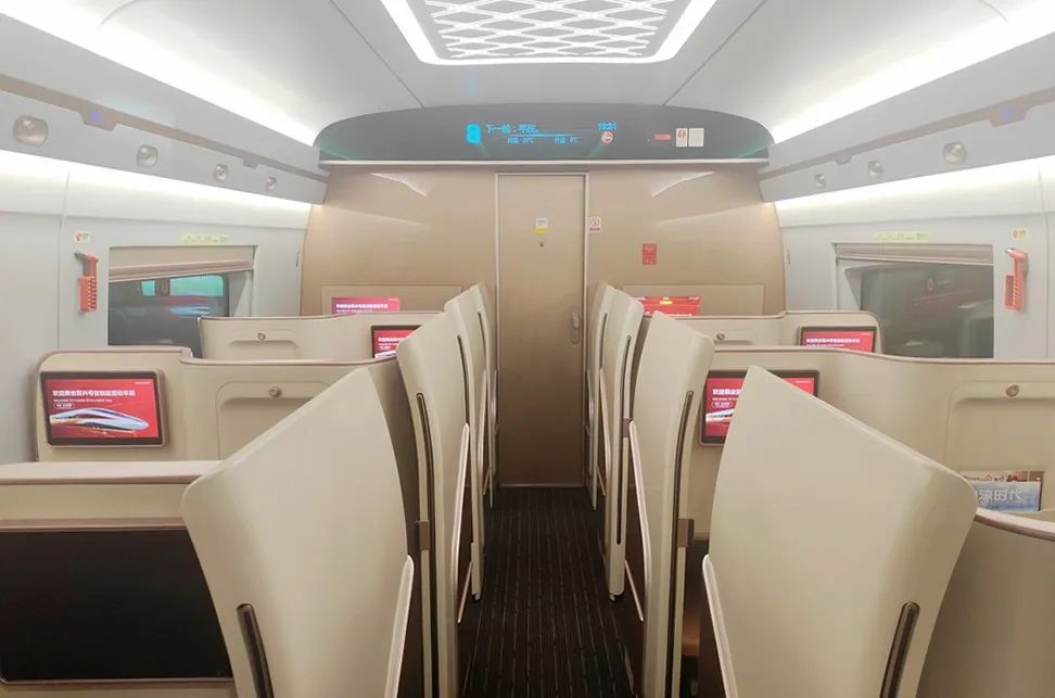 在空間布局方面,CR400BF-GS型動車組通過設(shè)備小型化、集成化的措施,對車廂內(nèi)的整體平面布局進行了優(yōu)化。車端占用空間得以縮小,客室空間相應(yīng)增大,列車定員由576人增至619人,顯著提高了動車組列車的載客能力。