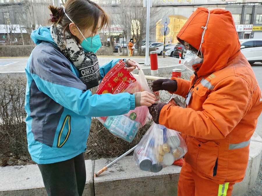 大家身穿志愿者馬甲,三五人一組結伴走上街頭,只要見到正在工作的環(huán)衛(wèi)工人,就會遞上一份節(jié)日暖心包,里面有臘八粥、小點心、春聯(lián)福字、兔年吉祥物裝飾卡片,還有酒精、口罩等防疫物資。