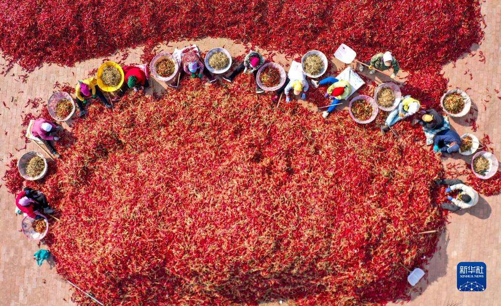 10月25日,在開魯縣東風(fēng)鎮(zhèn)東方紅村,工作人員分揀處理紅干椒(無人機(jī)照片)。新華社記者 連振 攝