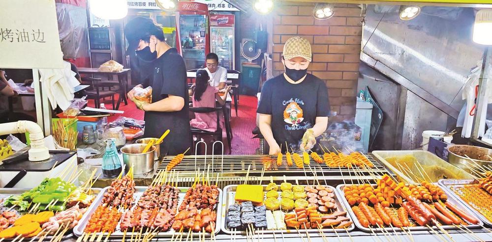 炭火上的羊肉串嗞嗞作響,油脂滴落,迸出金色火花,散發(fā)出誘人的香氣。客人圍坐在塑料小桌旁,手里拿著冰鎮(zhèn)啤酒,碰杯傳出清脆的響聲……這里沒(méi)有高檔餐廳的拘謹(jǐn),只有朋友相聚的歡樂(lè)和大口吃肉的暢快。大學(xué)生徐瑞虹放暑假后,經(jīng)常和朋友來(lái)夜市消暑?!拔覀儙讉€(gè)沒(méi)事就來(lái)萬(wàn)達(dá)金街轉(zhuǎn)一轉(zhuǎn),天太熱了,待在家里也悶,而且夜市里的這些小吃我們都比較喜歡,沒(méi)事幾個(gè)人喝幾瓶啤酒,聊一聊天,感覺(jué)還是很愜意的?!睂?duì)于年輕人來(lái)說(shuō),夜市不僅是美食的聚集地,更是釋放壓力、享受生活的好去處。在這里,他們可以暫時(shí)拋開(kāi)煩惱,盡情享受美食帶來(lái)的快樂(lè)。