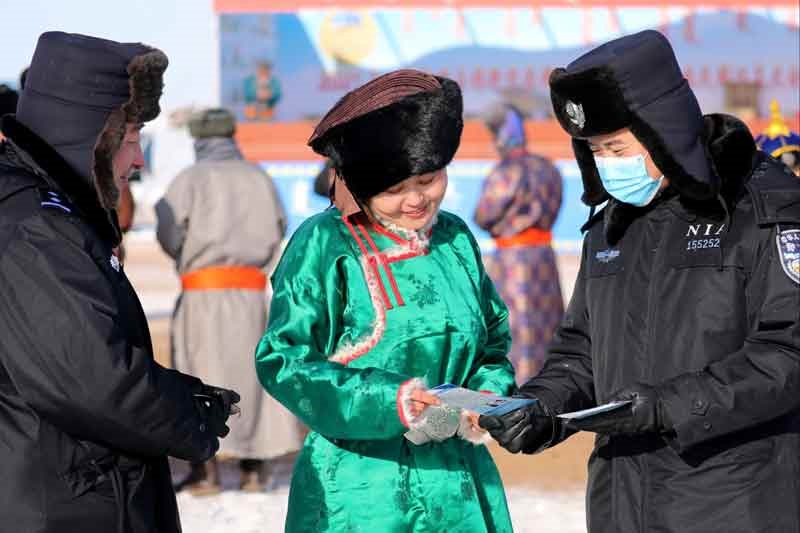 錫林郭勒邊境管理支隊(duì)達(dá)來、洪格爾、巴音都蘭等3 個(gè)邊境派出所共派出20多名警力,對(duì)于前來參加那達(dá)慕的人們進(jìn)行嚴(yán)格檢查,并向牧民群眾講解當(dāng)前面臨的新冠肺炎疫情防控形勢,發(fā)放宣傳冊(cè)。(內(nèi)蒙古日?qǐng)?bào)記者 巴依斯古楞 攝影報(bào)道)