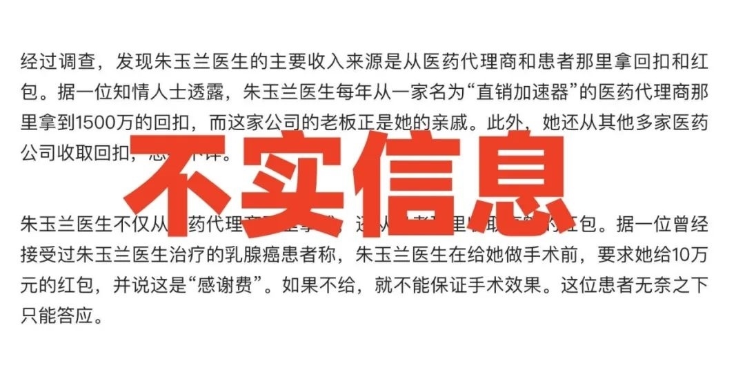 值得一提的是,該文將“抄家1.5億、20套房子”和“朱某某醫(yī)生的主要收入來源是從醫(yī)藥代理商和患者那里拿回扣和紅包”等信息列為“不實信息”,但未否認“朱某某被抓”。