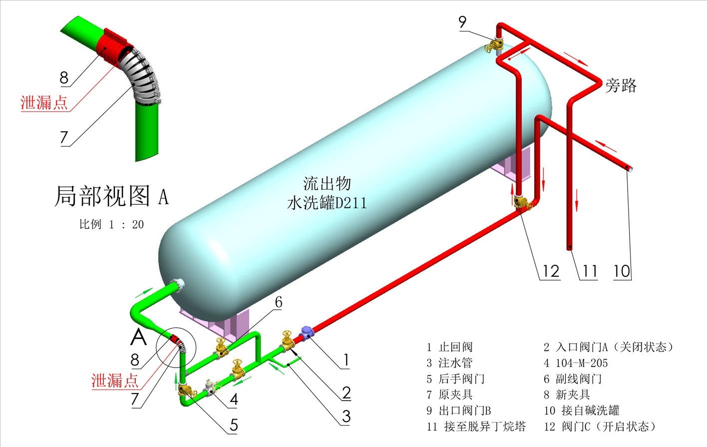 13時(shí)24分10秒,在新夾具兩側(cè)各安裝緊固1套螺栓時(shí),原夾具水平端的管道焊縫處突然斷裂,大量介質(zhì)從斷口噴出?,F(xiàn)場監(jiān)護(hù)人員立即向外疏散并安排烷基化裝置內(nèi)操人員緊急停車。