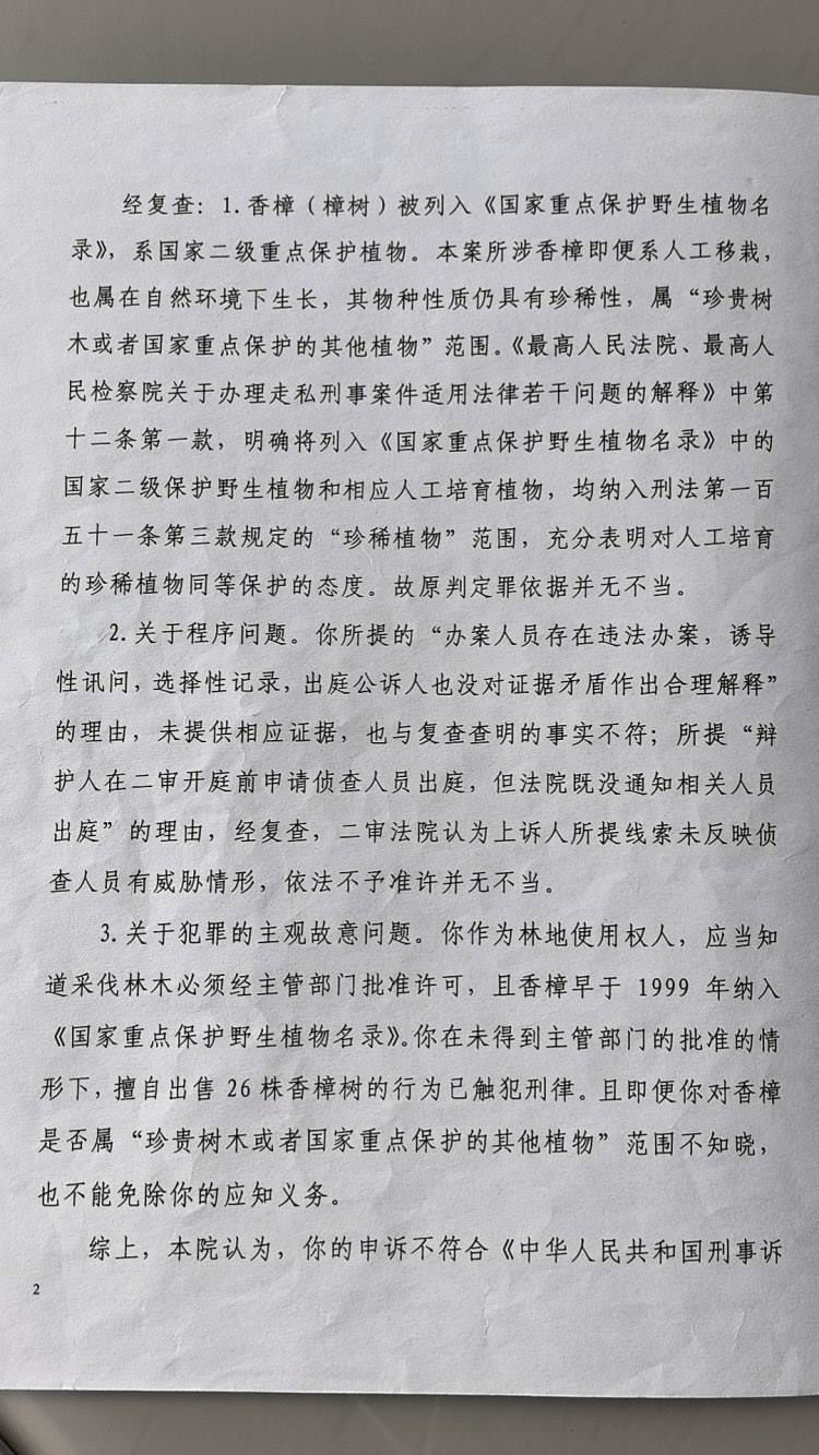 上游新聞記者注意到,敘永縣法院一審判決中還引用了最高法、最高檢《關(guān)于辦理走私刑事案件適用法律若干問題的解釋》,以“國家禁止、限制出口的珍稀植物,包括相關(guān)名錄中人工培育的植物”為由,認(rèn)定了人工栽植的國家重點(diǎn)保護(hù)物種也應(yīng)予以保護(hù)的結(jié)論。敘永縣法院綜合認(rèn)定,馬萬林等砍伐、售賣的香樟樹屬于國家重點(diǎn)保護(hù)植物,對辯方提出的“香樟樹不屬于重點(diǎn)保護(hù)野生植物”的辯護(hù)理由不予采納,但在量刑時予以考慮,酌情減輕了對兩名被告人的處罰。