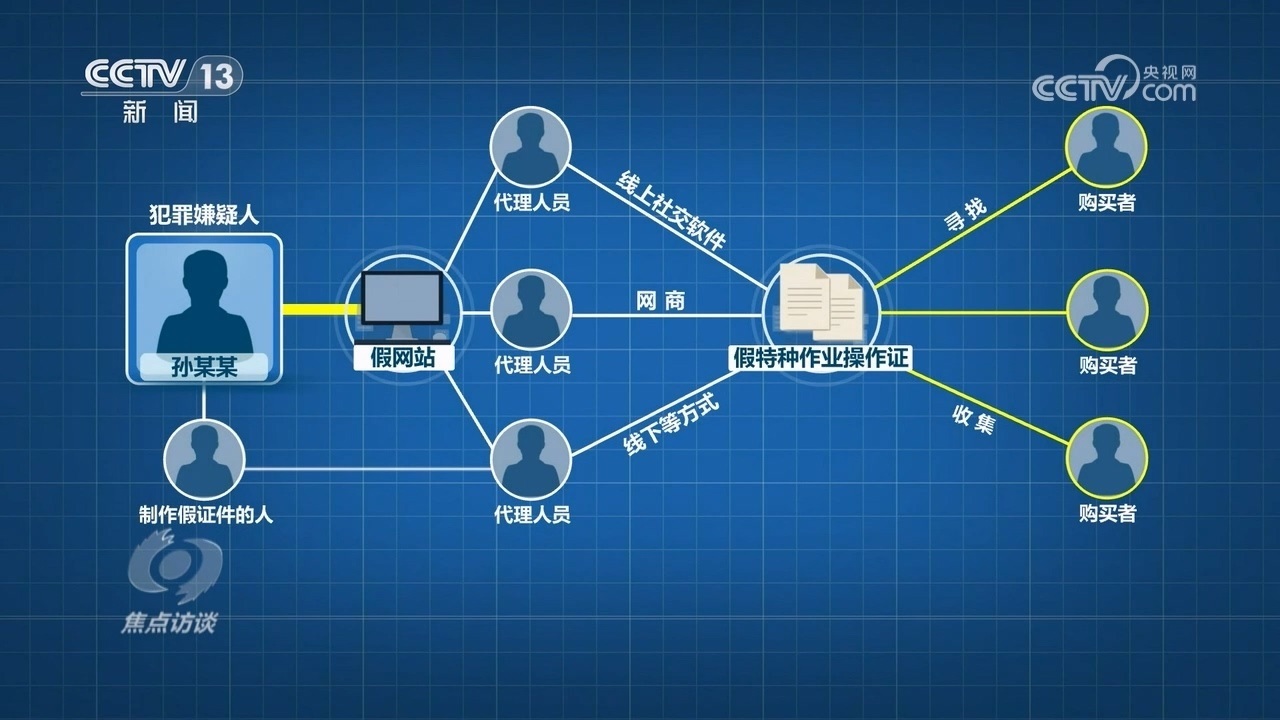 據(jù)介紹,犯罪嫌疑人孫某某是最上游,他首先花錢雇人制作了假網(wǎng)站,然后發(fā)展多名代理人員,代理通過線上社交軟件、網(wǎng)商和線下等方式,尋找、收集花錢購買假的特種作業(yè)操作證的人員。由專門負責(zé)制作假證件的人,制作好假證,發(fā)送給相應(yīng)的下線代理人員,最后到購買者手里。