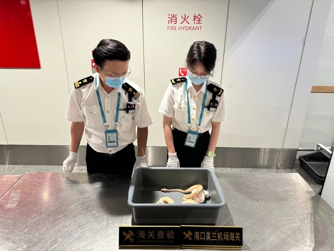央視網(wǎng)消息:據(jù)“海關(guān)發(fā)布”公眾號消息,近日,??诤jP(guān)所屬海口美蘭機(jī)場海關(guān)在監(jiān)管入境客運(yùn)航班時(shí),現(xiàn)場關(guān)員通過先期機(jī)檢發(fā)現(xiàn)1件托運(yùn)行李圖像存在異常。攜帶該件行李的旅客通關(guān)時(shí)選擇無申報(bào)通道,未向海關(guān)申報(bào)任何物品。經(jīng)現(xiàn)場關(guān)員開箱查驗(yàn),在其行李物品內(nèi)查獲4個(gè)裝有活物的白色布袋,拆開后發(fā)現(xiàn)每只布袋中均包裹有活體蛇類1條,共計(jì)4條。經(jīng)鑒定,這4條活體蛇為球蟒,屬于《瀕危野生動(dòng)植物種國際貿(mào)易公約》(CITES)附錄Ⅱ列明物種。