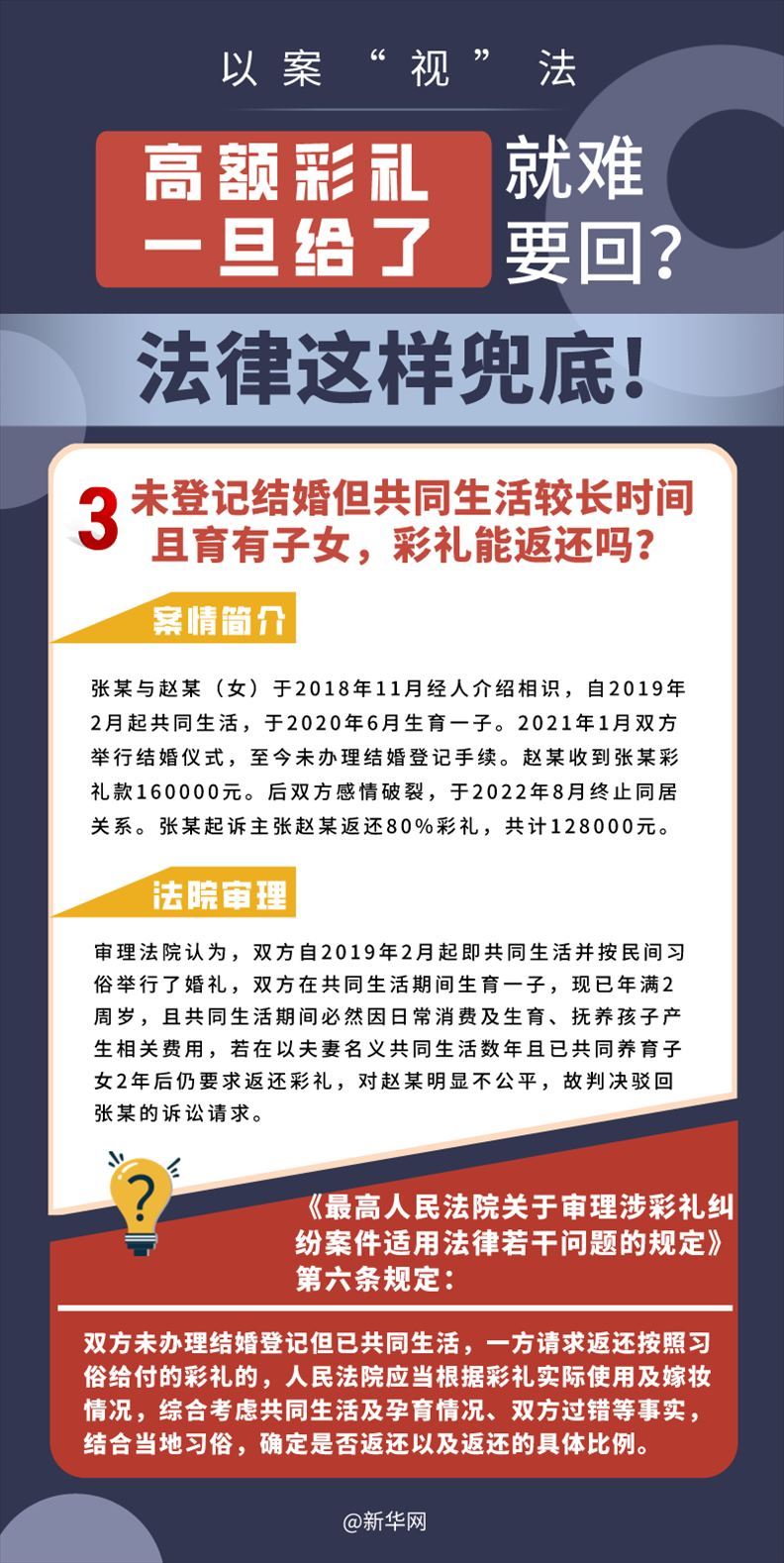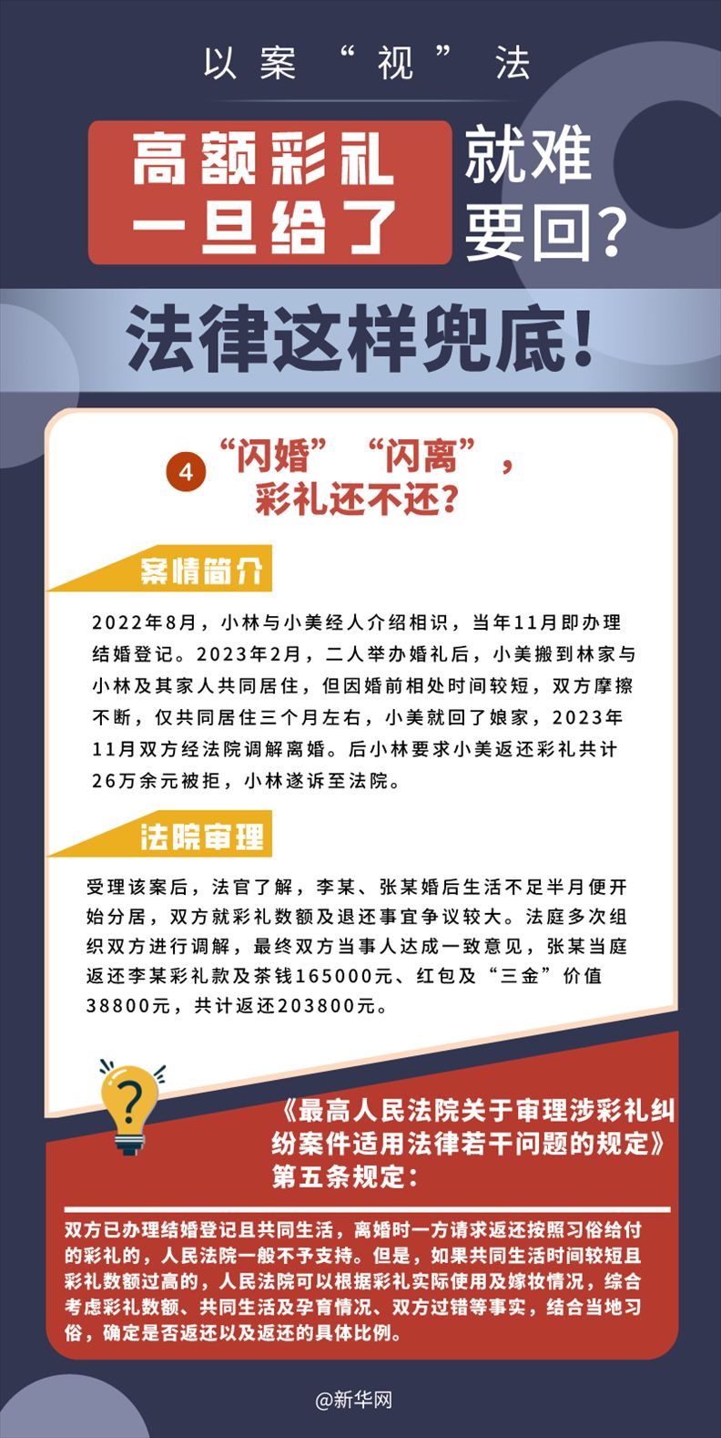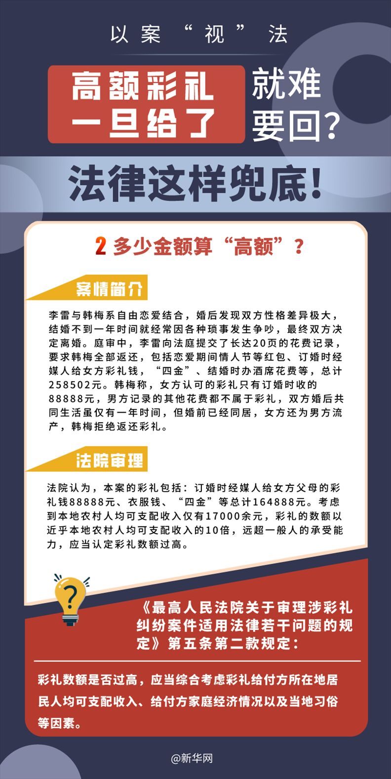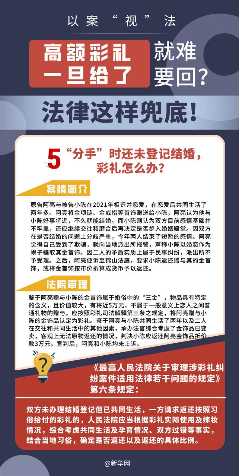 “五一”長(zhǎng)假期間,各地迎來了婚禮高峰期,“彩禮”話題,尤其農(nóng)村高額彩禮現(xiàn)象備受關(guān)注。破解高價(jià)彩禮,在解決爭(zhēng)議的層面,司法盡了最大努力兜底。本期《以案“視”法》針對(duì)涉“高額彩禮”糾紛,帶大家學(xué)習(xí)相關(guān)法律知識(shí)。