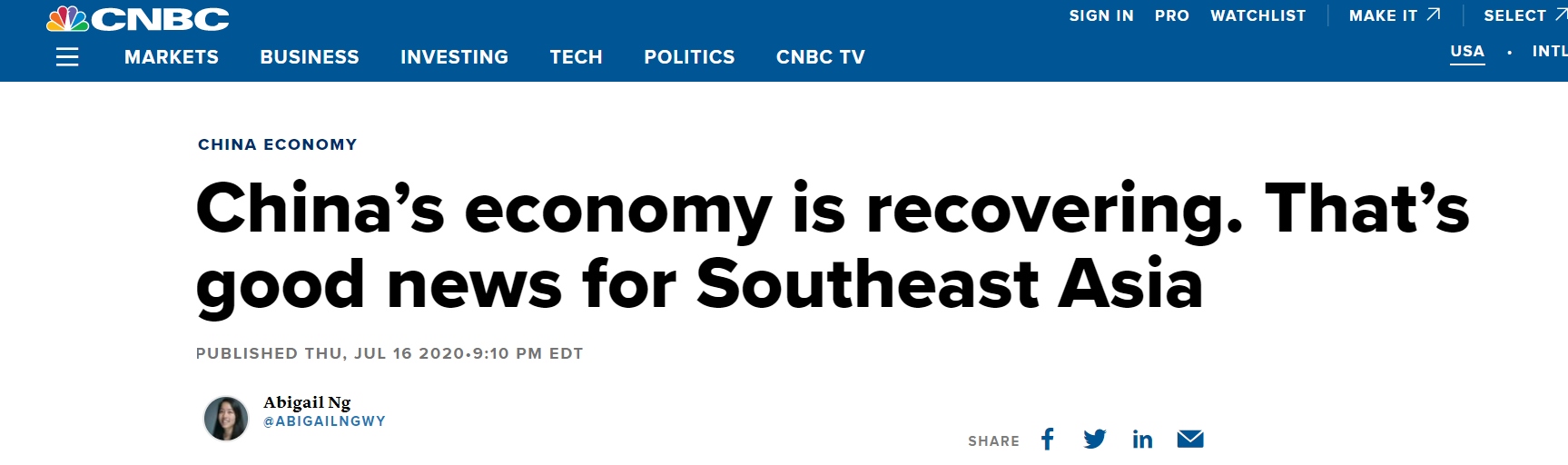美國消費(fèi)者新聞與商業(yè)頻道(CNBC)17日發(fā)表文章,題為《中國經(jīng)濟(jì)正在復(fù)蘇,這對(duì)東南亞是個(gè)好消息》。文中指出,作為東盟出口商品最多的國家,中國經(jīng)濟(jì)穩(wěn)步增長成為東南亞國家“關(guān)鍵資產(chǎn)”。“盡管還有許多挑戰(zhàn),這一增長重新點(diǎn)燃了中國經(jīng)濟(jì)可以幫助其他國家復(fù)蘇的希望”,華僑銀行(OCBC Bank)經(jīng)濟(jì)學(xué)家維蘭托(Wellian Wiranto)16日表示。