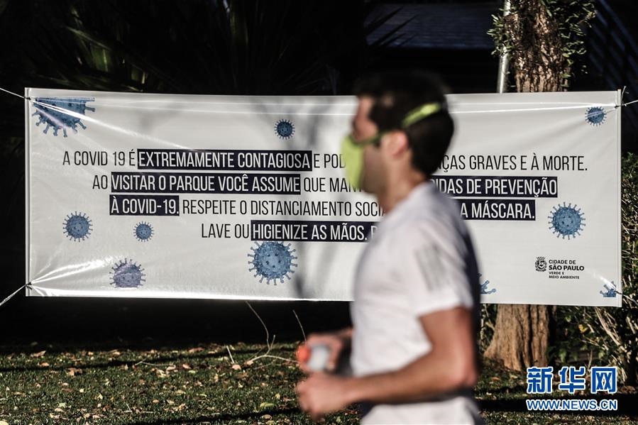 這是7月13日,在巴西圣保羅市重新開放的伊比拉普埃拉公園內(nèi),一名男子經(jīng)過提醒游客做好防護的條幅。新華社發(fā)(拉赫爾·帕特拉索攝)