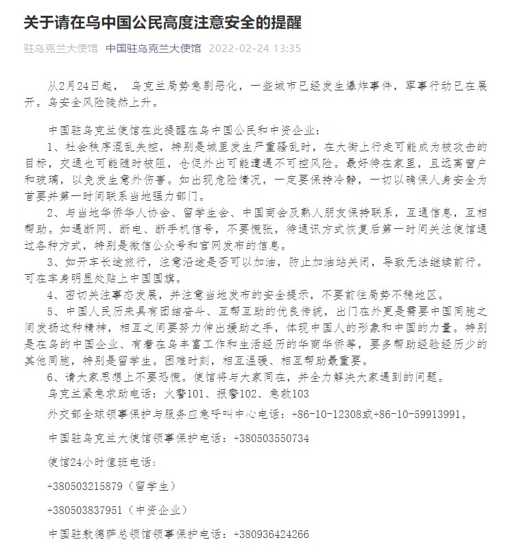 從2月24日起,烏克蘭局勢急劇惡化,一些城市已經(jīng)發(fā)生爆炸事件,軍事行動已在展開。烏安全風(fēng)險陡然上升。