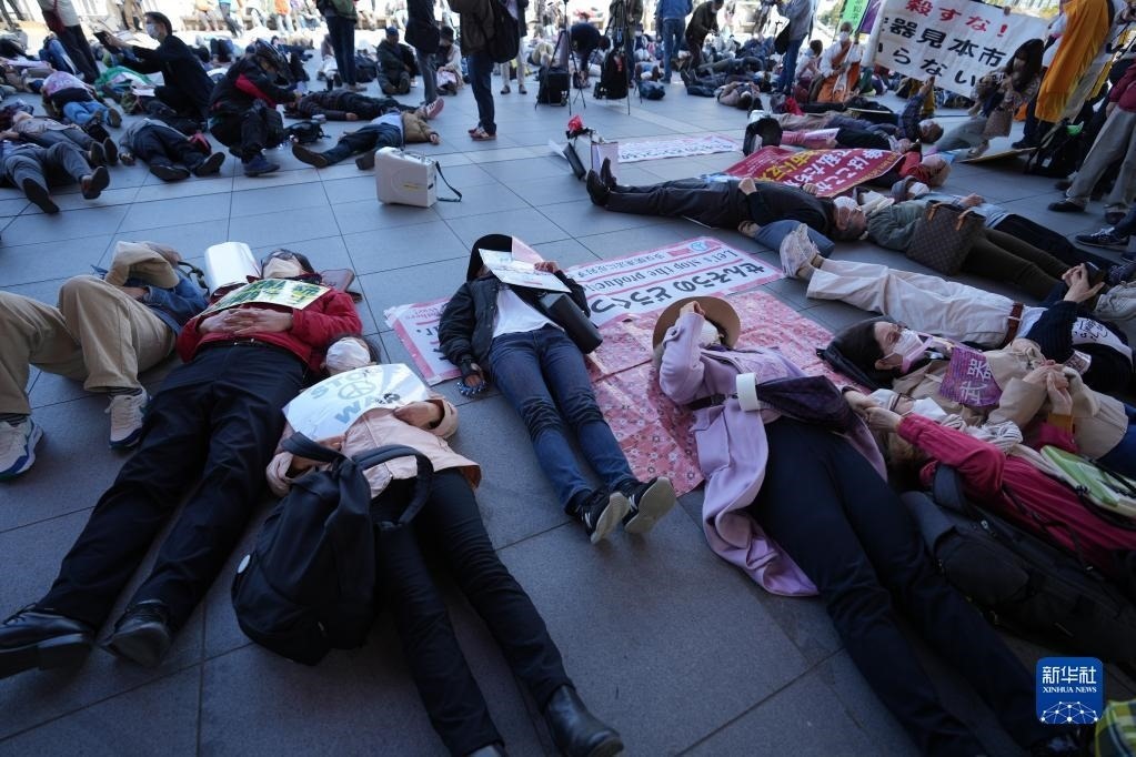 當日,300多名民眾聚集在會展中心門前,高喊“拒絕為戰(zhàn)爭準備”“拒絕死亡商人”“反對戰(zhàn)爭”等口號強烈抗議日本強化武器交易。抗議演講之后,民眾還集體倒地,以行為語言以示抗議。
