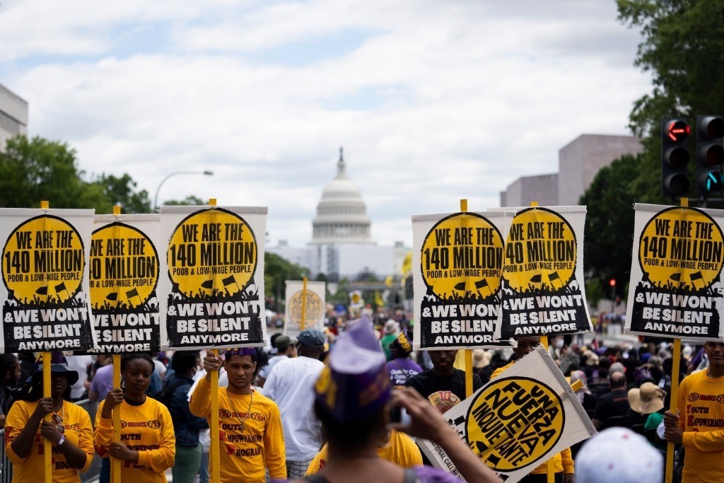 2022年6月18日,來自美國全國各地的數(shù)千民眾在華盛頓國會(huì)大廈附近舉行集會(huì),抗議美國根深蒂固的種族歧視以及由此引發(fā)的經(jīng)濟(jì)不公等一系列社會(huì)問題。新華社記者劉杰攝