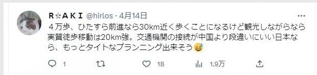 “4萬步,直線距離相當(dāng)于將近30公里,不過如果是徒步邊走邊逛景點,差不多是20來公里。如果在公共交通更便利的日本,應(yīng)該能壓縮出一個更緊湊的行程。”