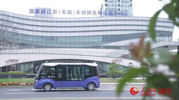 行駛在無(wú)錫車聯(lián)網(wǎng)小鎮(zhèn)的無(wú)人駕駛小巴車。人民網(wǎng)記者 劉寧 攝