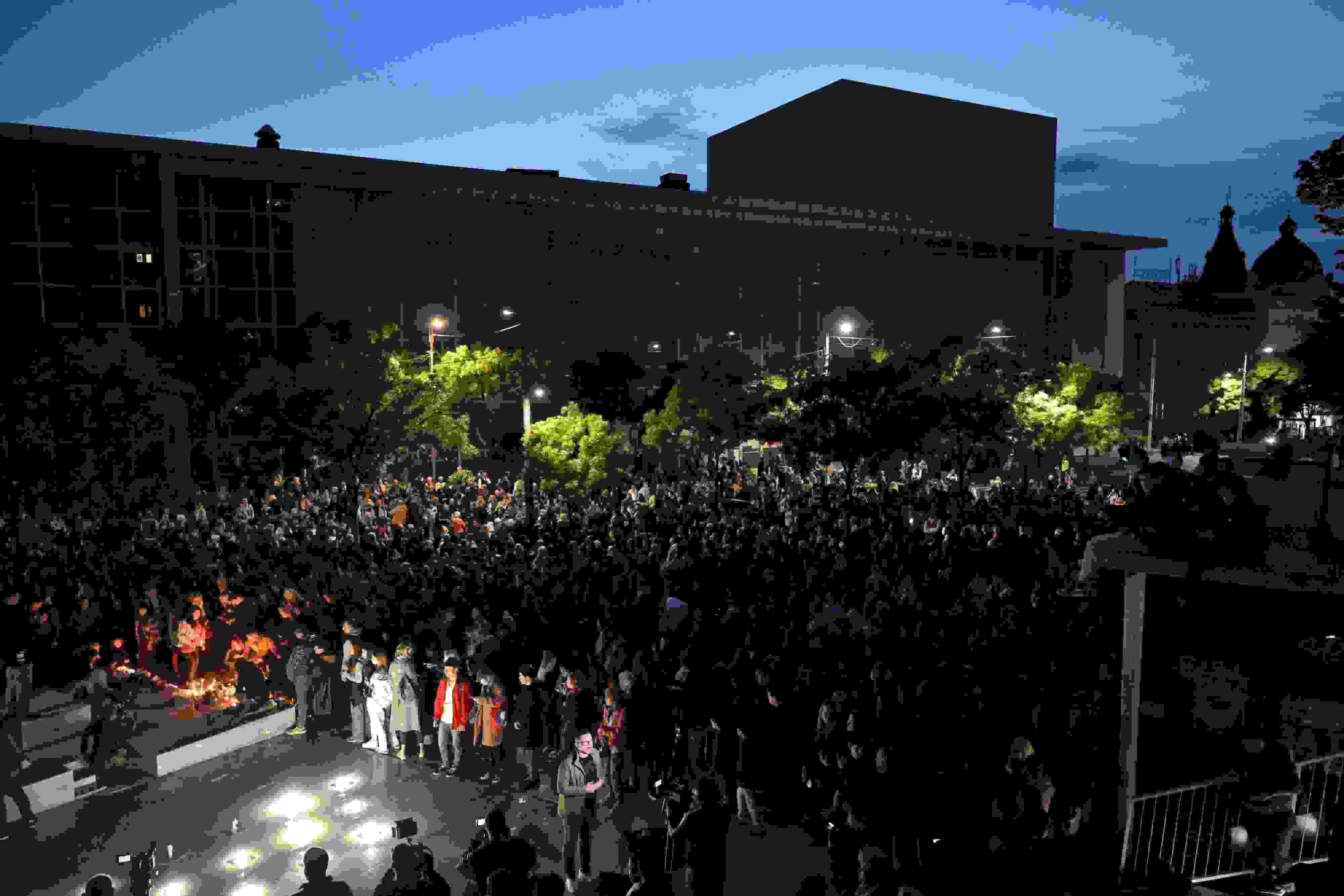 當?shù)貢r間2023年5月3日,塞爾維亞貝爾格萊德,人們在學校門前悼念遇難者。 視覺中國