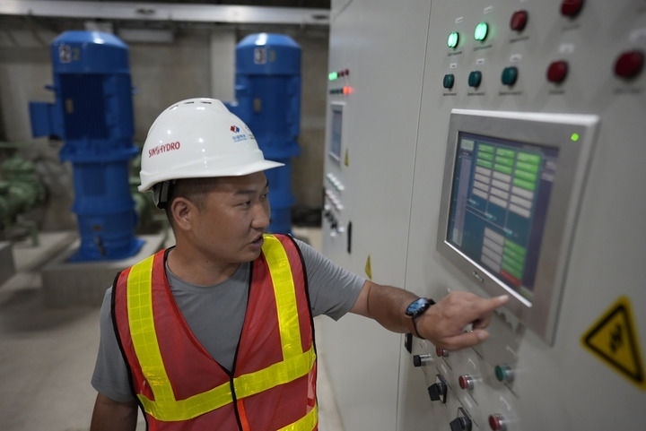 帕圖卡三水電站內(nèi),水電站工程技術(shù)部經(jīng)理張震在操作設(shè)備。(戴維·德拉帕斯攝)