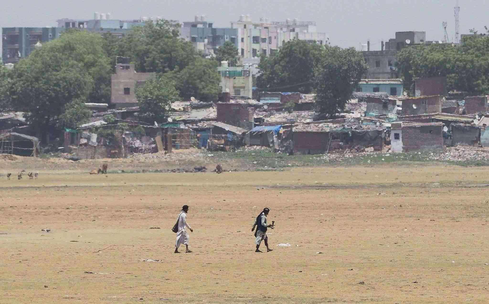 當(dāng)?shù)貢r(shí)間2023年5月10日,印度艾哈邁達(dá)巴德,人們走在干涸的河床上。