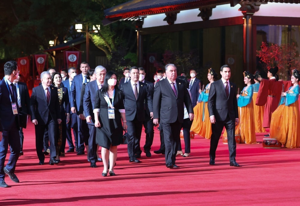 哈薩克斯坦總統(tǒng)托卡耶夫、吉爾吉斯斯坦總統(tǒng)扎帕羅夫和夫人扎帕羅娃、塔吉克斯坦總統(tǒng)拉赫蒙、土庫(kù)曼斯坦總統(tǒng)別爾德穆哈梅多夫、烏茲別克斯坦總統(tǒng)米爾濟(jì)約耶夫和夫人米爾濟(jì)約耶娃抵達(dá)紫云樓前。