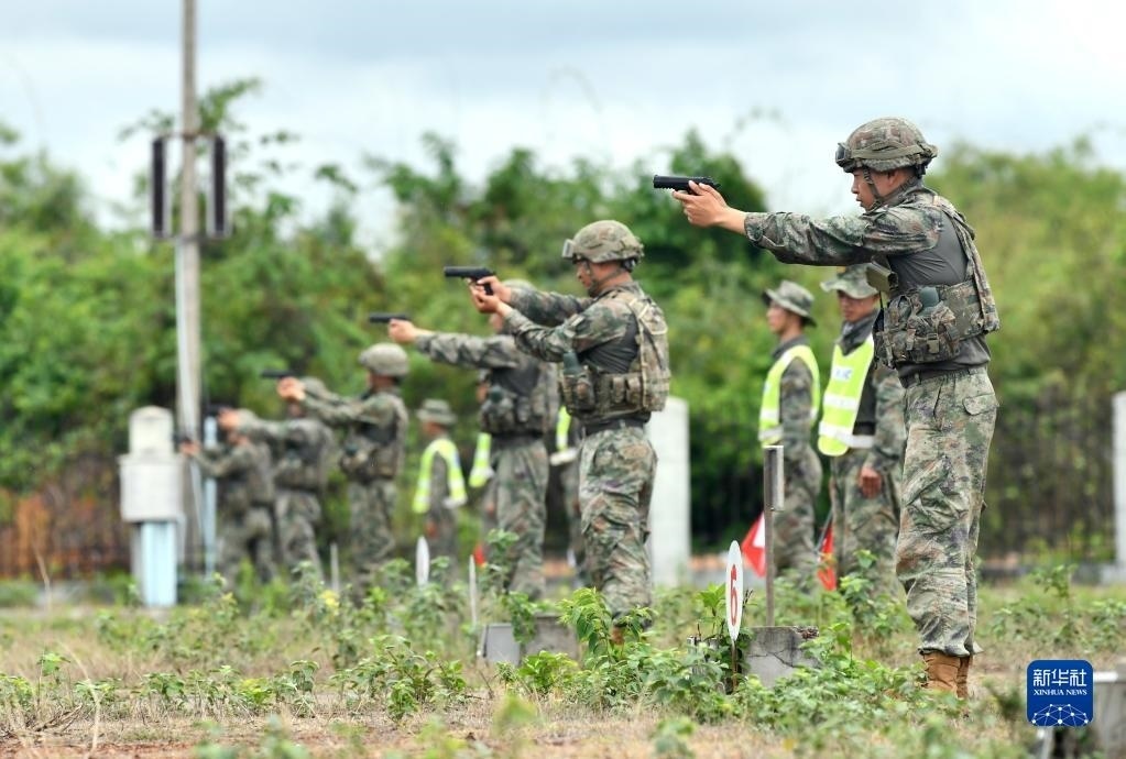 5月13日,在老撾人民軍庫瑪?shù)W院訓練場,中方參演官兵進行手槍射擊示范。