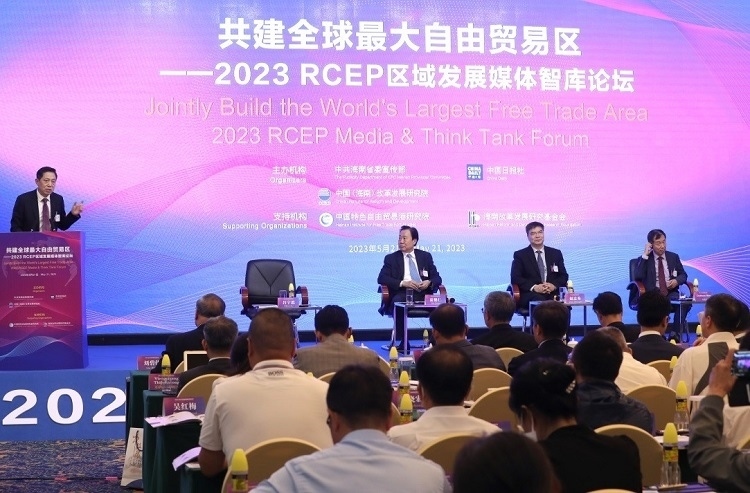 人民網(wǎng)???月21日電 (記者苑基榮)《區(qū)域全面經(jīng)濟伙伴關(guān)系協(xié)定》(以下簡稱RCEP)正式生效實施一年多來,其促進區(qū)域貿(mào)易投資增長與經(jīng)濟復蘇的紅利不斷釋放。5月21日,中共海南省委宣傳部、中國日報社、中國(海南)改革發(fā)展研究院在海口共同主辦“共建全球最大自由貿(mào)易區(qū)——2023 RCEP區(qū)域發(fā)展媒體智庫論壇”。來自中國、韓國、日本、新加坡、菲律賓、老撾、緬甸、柬埔寨、馬來西亞、印度尼西亞、澳大利亞、英國等國家的主流媒體、智庫人士以及國際組織、駐華使館官員和企業(yè)界共450余位代表參加本次論壇,共同圍繞“共建全球最大自由貿(mào)易區(qū)”分享觀點、交流思想,為推動區(qū)域交流合作積極建言獻策。