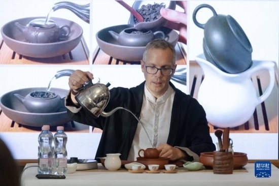 6月1日,在匈牙利布達佩斯,一名茶文化愛好者在“茶和天下·雅集”活動上向嘉賓展示沖泡中國茶。新華社發(fā)(弗爾季·奧蒂洛攝)