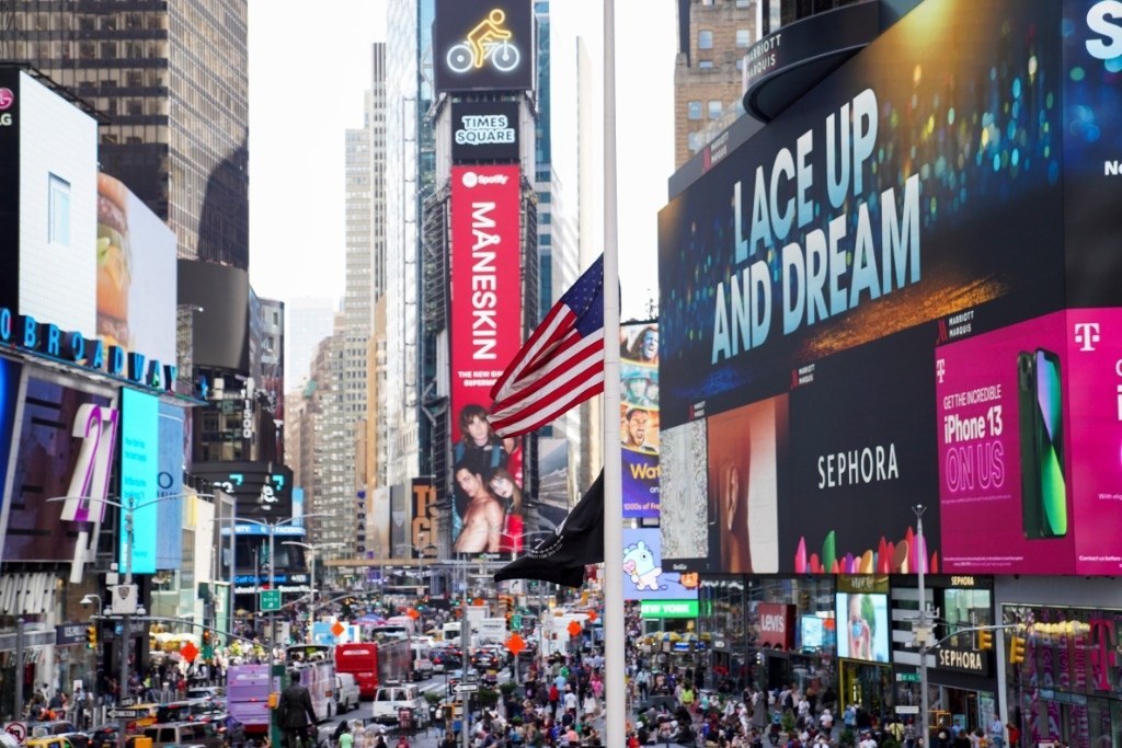這是2022年5月17日在美國紐約時報廣場拍攝的美國國旗。新華社記者王迎攝