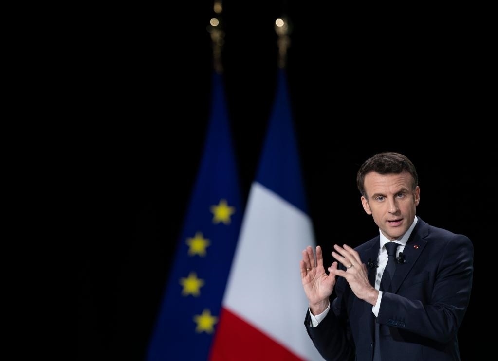 2022年3月17日,法國(guó)總統(tǒng)馬克龍?jiān)诎屠璞苯既{-圣但尼省舉行的新聞發(fā)布會(huì)上介紹競(jìng)選綱領(lǐng)。新華社發(fā)(肖恩·洛朗攝)