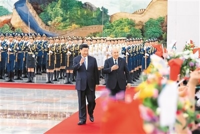 | 七月十八日下午,國家主席習(xí)近平在北京人民大會堂同來華進(jìn)行國事訪問的阿爾及利亞總統(tǒng)特本舉行會談。這是會談前,習(xí)近平在人民大會堂北大廳為特本舉行歡迎儀式。新華社記者 翟健嵐攝 |