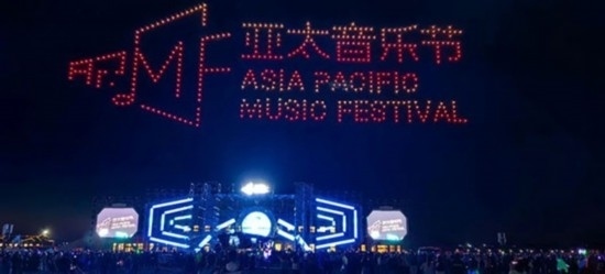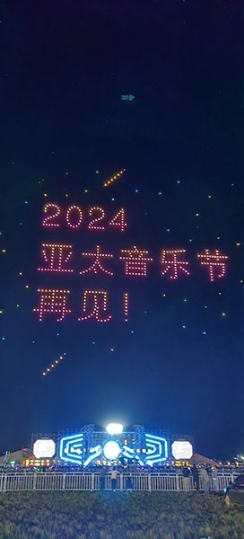 在氣氛最熱烈的時候,500架無人機緩緩升空,列隊表演,不斷變換陣型,時而在空中呈現(xiàn)出“亞太音樂節(jié)”、“中國外文局亞太傳播中心”、“太仆寺旗歡迎您”等巨幅字幕,時而呈現(xiàn)吉他、音符、蒙古包等色彩繽紛的圖案。