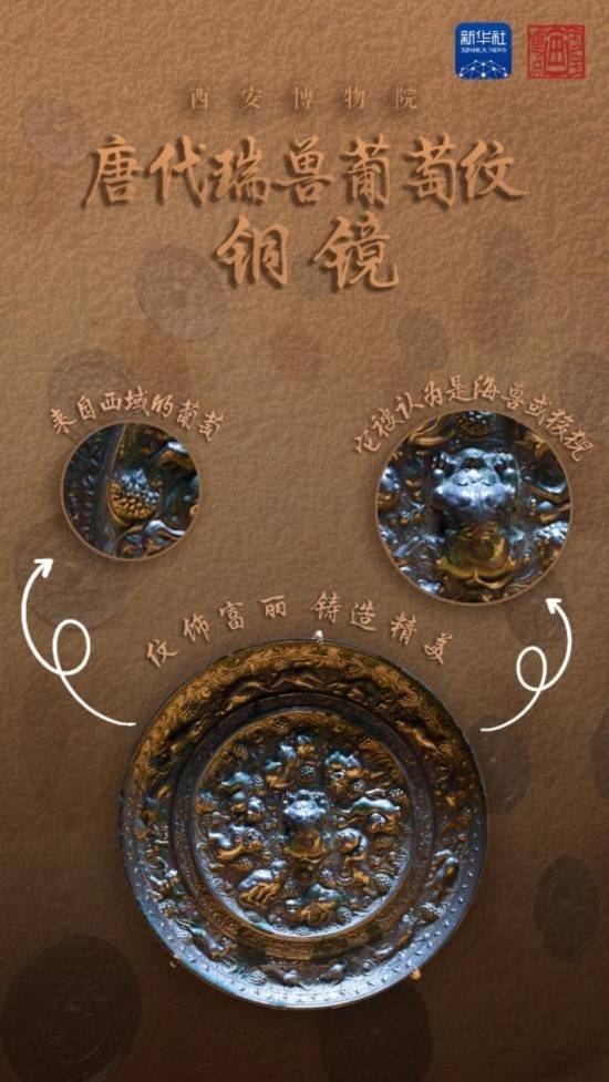 在唐代,我國銅鏡制作和使用進入繁盛時期,許多通過絲綢之路傳來的紋樣被工匠應用在銅鏡上。瑞獸葡萄紋銅鏡紋飾富麗、鑄造精美,備受當時民眾的青睞。瑞獸葡萄紋銅鏡將裝飾藝術(shù)和現(xiàn)實生活緊密結(jié)合,瑞獸象征著敏捷與美好,葡萄則象征著豐收充裕和多子多福,呈現(xiàn)出濃郁的盛唐氣象,是我國古代中西方文化交流的代表性產(chǎn)物。
