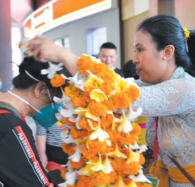 在印度尼西亞巴厘島伍拉萊國際機(jī)場,工作人員為中國游客佩戴迎賓花環(huán)。新華社記者 徐 欽攝