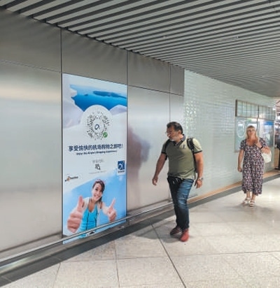 希臘雅典國際機(jī)場內(nèi),旅客走過用中文書寫的廣告海報(bào)。本報(bào)記者 謝亞宏攝