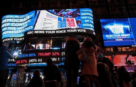 2020年11月3日,人們?cè)诿绹~約時(shí)報(bào)廣場觀看總統(tǒng)選舉實(shí)時(shí)計(jì)票結(jié)果。新華社記者王迎攝