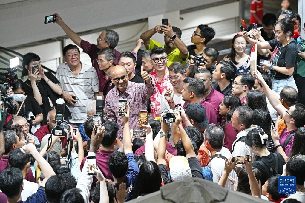 9月1日,新加坡總統(tǒng)候選人尚達(dá)曼(中)在裕廊等待總統(tǒng)選舉結(jié)果揭曉時向支持者致意。新華社發(fā)(鄧智煒攝)