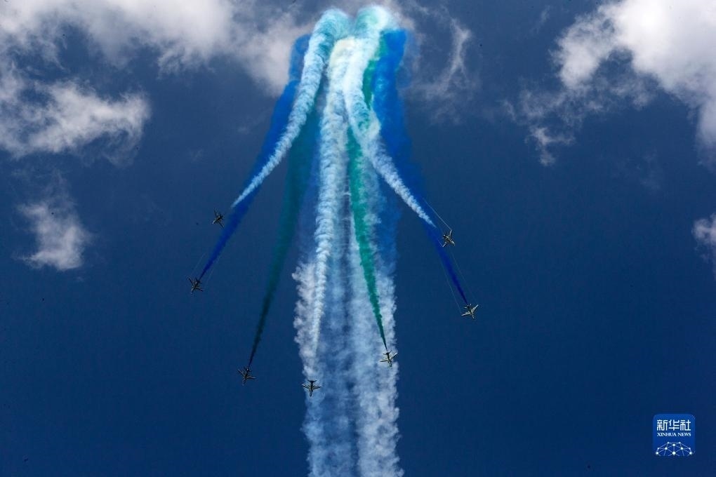 9月2日,在希臘塔納格拉空軍基地的雅典飛行周上,來自阿聯(lián)酋的飛行表演隊進行表演。新華社發(fā)(馬里奧斯·羅洛斯攝)
