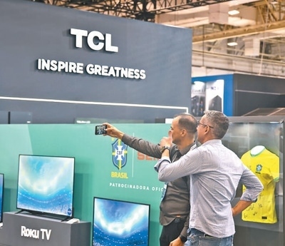 在2023年圣保羅國際消費(fèi)類電子及家用電器產(chǎn)品展覽會上,參觀者在TCL展臺前合影留念。本報(bào)記者 時(shí)元皓攝