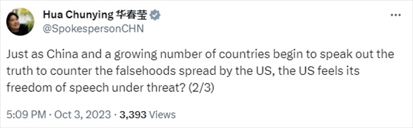 美國(guó)國(guó)務(wù)院上月28日炮制虛假報(bào)告,謊稱中國(guó)正斥資數(shù)十億美元在全球散布虛假信息。我外交部發(fā)言人華春瑩3日在X平臺(tái)對(duì)美方的謬論予以了駁斥。