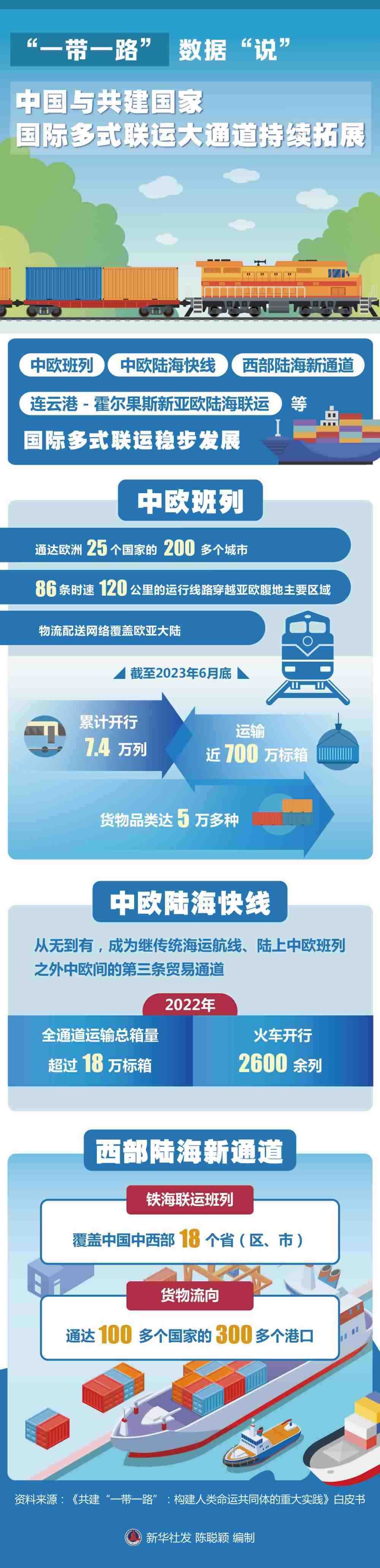 國際多式聯(lián)運大通道持續(xù)拓展。中歐班列、中歐陸海快線、西部陸海新通道、連云港-霍爾果斯新亞歐陸海聯(lián)運等國際多式聯(lián)運穩(wěn)步發(fā)展。中歐班列通達歐洲25個國家的200多個城市,86條時速120公里的運行線路穿越亞歐腹地主要區(qū)域,物流配送網(wǎng)絡(luò)覆蓋歐亞大陸;截至2023年6月底,中歐班列累計開行7.4萬列,運輸近700萬標箱,貨物品類達5萬多種,涉及汽車整車、機械設(shè)備、電子產(chǎn)品等53大門類,合計貨值超3000億美元。中歐陸??炀€從無到有,成為繼傳統(tǒng)海運航線、陸上中歐班列之外中歐間的第三條貿(mào)易通道,2022年全通道運輸總箱量超過18萬標箱,火車開行2600余列。西部陸海新通道鐵海聯(lián)運班列覆蓋中國中西部18個?。▍^(qū)、市),貨物流向通達100多個國家的300多個港口。