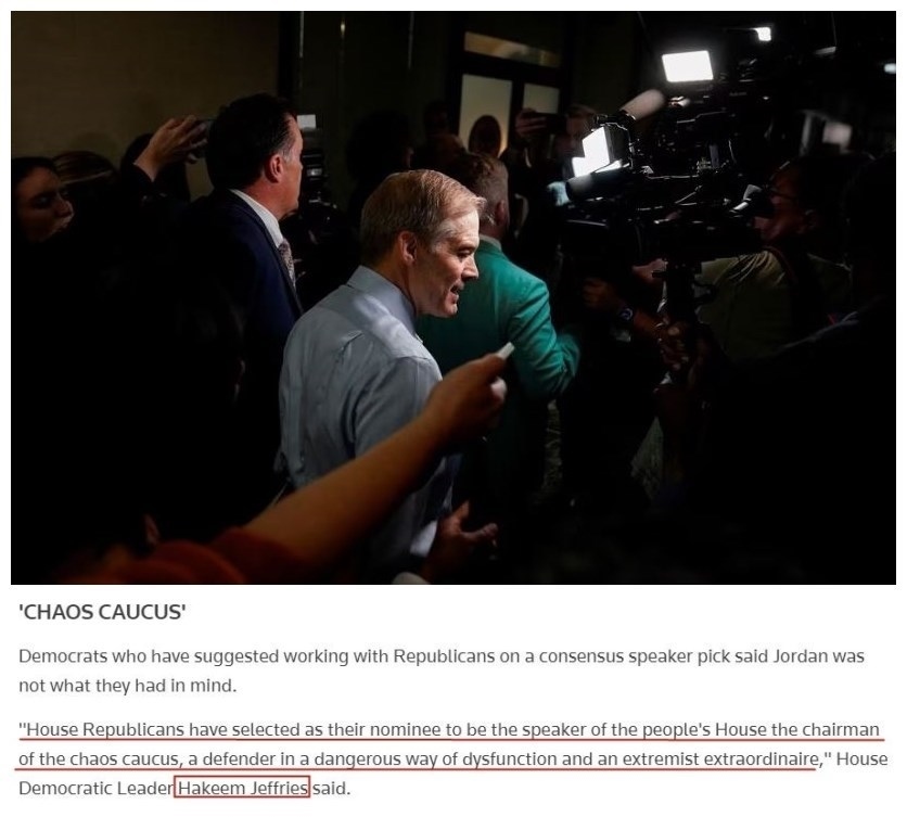 作為民主黨議長(zhǎng)候選人的眾議院少數(shù)黨領(lǐng)袖哈基姆·杰弗里斯13日警告,在眾議院共和黨人的“內(nèi)戰(zhàn)”仍在繼續(xù)的情況下,作為“極端主義者”的喬丹獲得提名只會(huì)讓國(guó)會(huì)變得“更加極端和混亂”。
