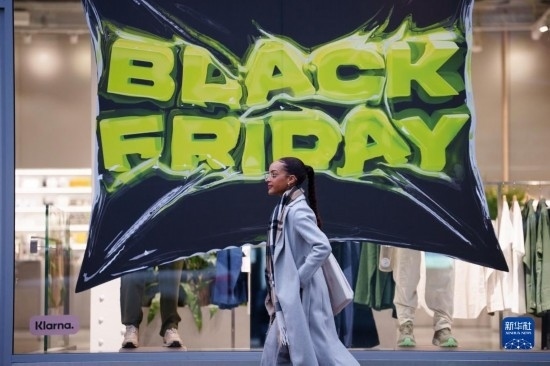 11月22日,在英國(guó)曼徹斯特,一名女子走過(guò)“黑色星期五”促銷(xiāo)廣告。新華社發(fā)(喬恩·休珀攝)