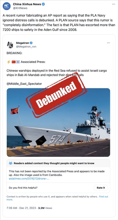 一個名為“Megatron”的擁有十多萬“粉絲”的賬號在社交平臺“X”(原推特)上說:“美聯(lián)社突發(fā)新聞!中國軍艦在曼德海峽拒絕協(xié)助以色列貨船,且無視他們的呼救?!辟N文后還配了一張中國軍艦的照片。