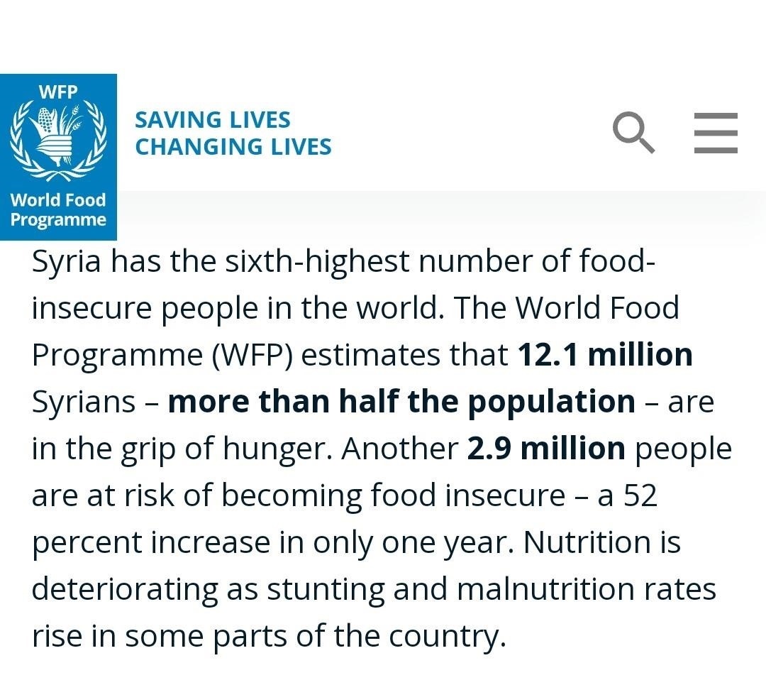世界糧食計劃署稱超過一半敘利亞的人口在饑餓邊緣