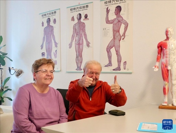 ?12月11日,在瑞士邊境城市沙夫豪森的一家中醫(yī)診所,患者莫吉爾(右)稱贊中醫(yī)療效顯著。