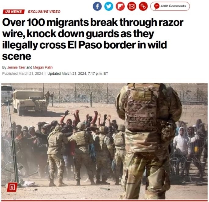 中新網(wǎng)3月22日電 綜合外媒報(bào)道,當(dāng)?shù)貢r(shí)間21日,在得克薩斯州邊境墻附近,有上百名非法移民沖破鐵絲網(wǎng)試圖非法進(jìn)入美國。他們撞倒得州國民警衛(wèi)隊(duì)成員,試圖越過美墨邊境,場面一度十分混亂。