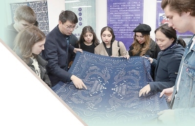 2024年3月20日,在江蘇南通市崇川區(qū)“文化崇川 游我所愛”中外文化交流活動中,來自俄羅斯、巴基斯坦、印度尼西亞、盧旺達(dá)等國家的學(xué)生現(xiàn)場了解藍(lán)印花布印染技藝。許叢軍攝(人民視覺)