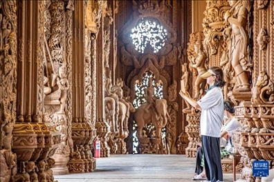 3月29日,游客在泰國芭堤雅真理圣殿游覽。新華社記者 王騰 攝