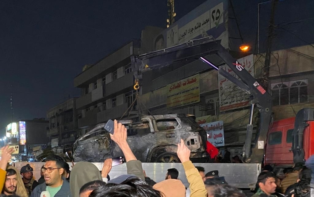 ?2024年2月7日,在伊拉克首都巴格達(dá),民防部門轉(zhuǎn)移遭無人機襲擊的車輛。新華社發(fā)(哈利勒·達(dá)伍德攝)