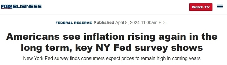 ??怂股虡I(yè)頻道在其另一篇報(bào)道中提到,據(jù)8日公布的一項(xiàng)紐約聯(lián)邦儲(chǔ)備銀行(Federal Reserve Bank of New York)進(jìn)行的消費(fèi)者預(yù)期調(diào)查顯示,美國(guó)人正在為未來(lái)幾年的高通脹率做準(zhǔn)備,公眾普遍的預(yù)期中值為從現(xiàn)在起一年內(nèi)通脹率將上升3%,與前幾個(gè)月持平,并在未來(lái)幾年通脹將保持高位,這表明他們認(rèn)為粘性通脹恐會(huì)持續(xù)下去。