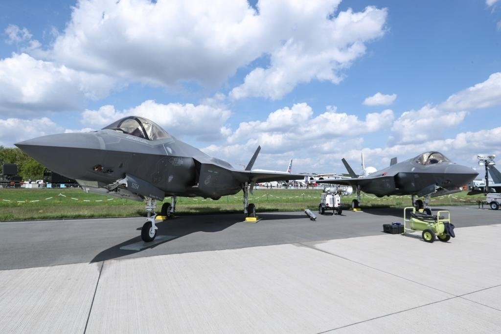?這是2018年4月27日在德國(guó)柏林國(guó)際航空航天展上拍攝的“F-35”型戰(zhàn)機(jī)。新華社記者單宇琦攝